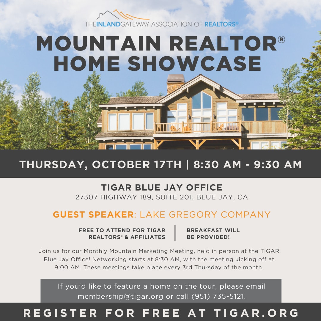 Please join us for our Monthly Mountain Marketing Meeting! Meetings will be in person at the TIGAR Blue Jay Office! 8:30 a.m. – 9:30 a.m. Mountain Area Marketing Meetings will be held the 3rd Thursday of every month. Contact information if you have a house you want to put on tour: membership@tigar.org, (951) 735-5121.