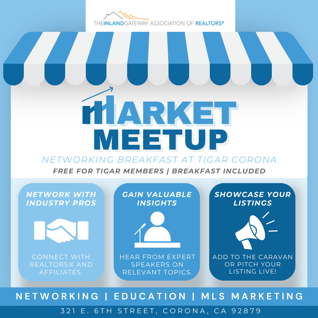 Fuel your morning with knowledge and connections at TIGAR’s Market Meetup Breakfast Meeting! Join us on the 3rd Thursday of every month at TIGAR Corona (321 E. Sixth Street, Corona, CA 92879) for an engaging and informative session focused on the real estate industry. Doors open at 8:30 AM, giving you time to grab a delicious breakfast provided by one of our affiliates before the meeting begins at 9:00 AM.