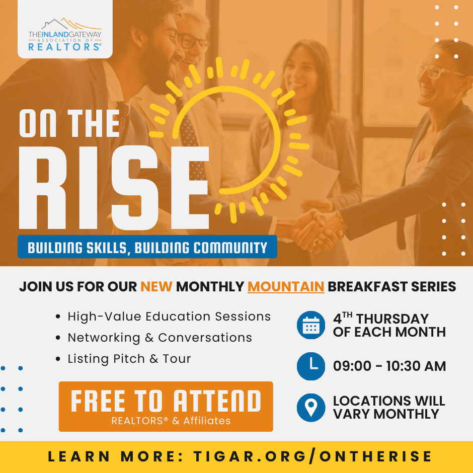 Start your morning with On the Rise, our mountain breakfast meeting series designed to help REALTORS® build skills, stay informed, and connect with colleagues serving our mountain communities. Each meeting features timely industry topics, expert speakers, and conversations focused on the unique aspects of doing business in the mountain region. It’s a great opportunity to gain valuable insights while networking with fellow REALTORS® who share your market.