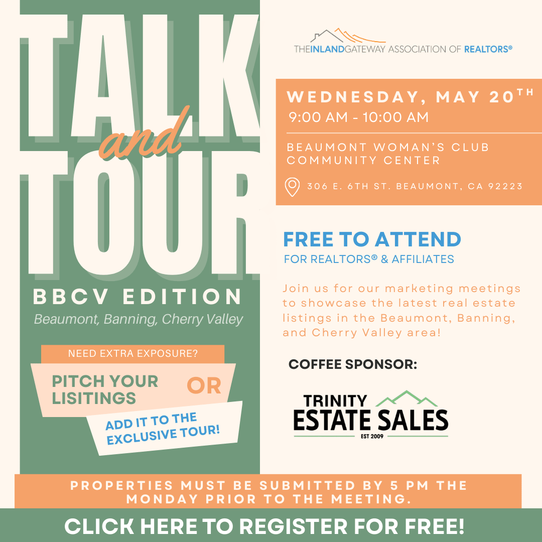 Join us for an engaging and informative twice-monthly event designed to showcase the latest real estate listings in the Beaumont, Banning, and Cherry Valley area! Talk & Tour: BBCV Edition brings together local agents, affiliates, and industry professionals for a dynamic networking experience. Attendees will have the chance to submit their listings for an exclusive caravan, hear from guest speakers, and connect with others in the real estate community. Whether you're looking to share your latest property or gain insights from industry experts, this event is the perfect opportunity to grow your network and learn something new!