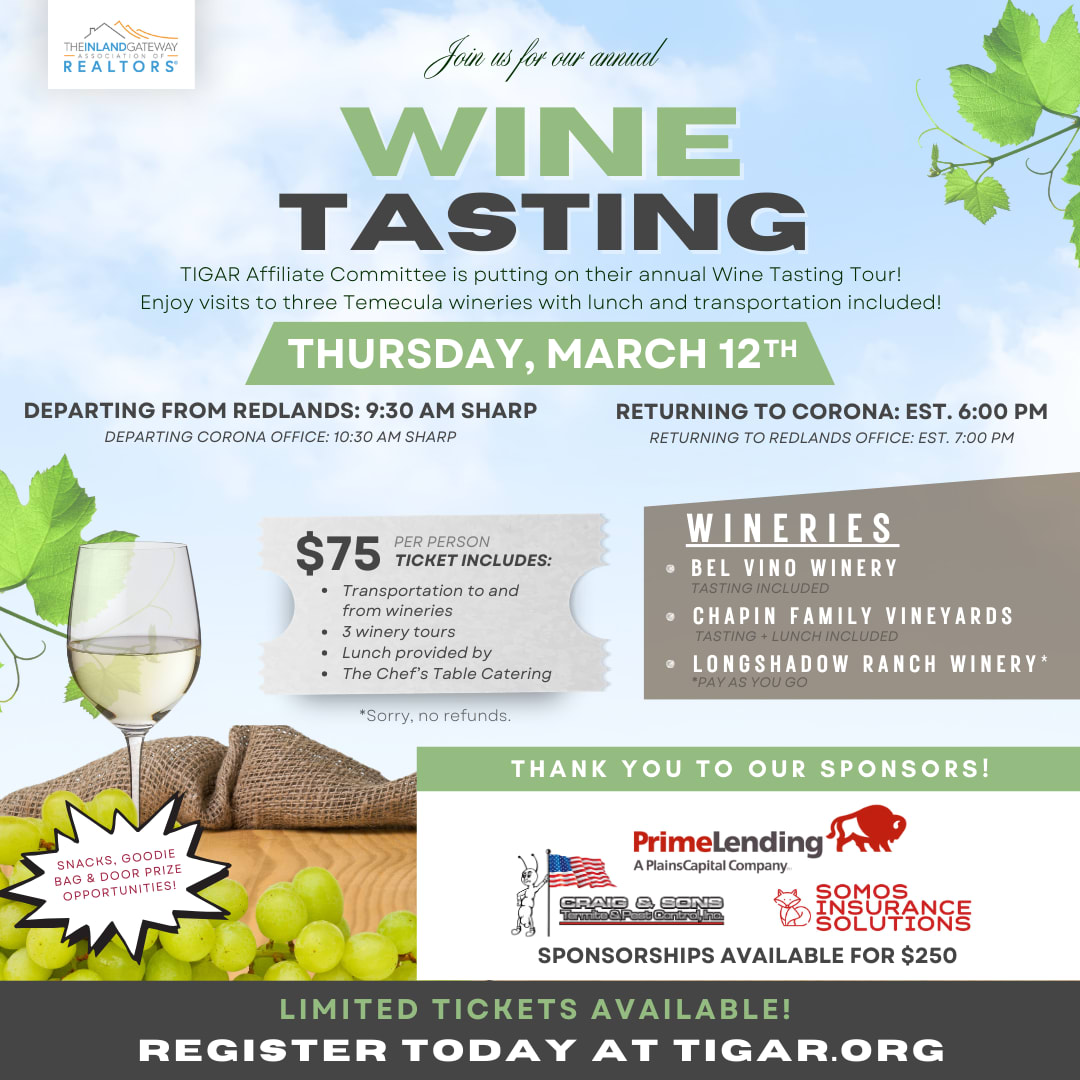 TIGAR’s Affiliate Committee is putting on its annual Wine Tasting Tour! Enjoy visits to three Temecula wineries with lunch and transportation included!
