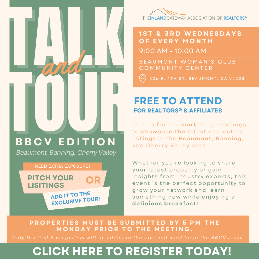Join us for an engaging and informative twice-monthly event designed to showcase the latest real estate listings in the Beaumont, Banning, and Cherry Valley area! Talk & Tour: BBCV Edition brings together local agents, affiliates, and industry professionals for a dynamic networking experience. Attendees will have the chance to submit their listings for an exclusive caravan, hear from guest speakers, and connect with others in the real estate community. Whether you're looking to share your latest property or gain insights from industry experts, this event is the perfect opportunity to grow your network and learn something new!