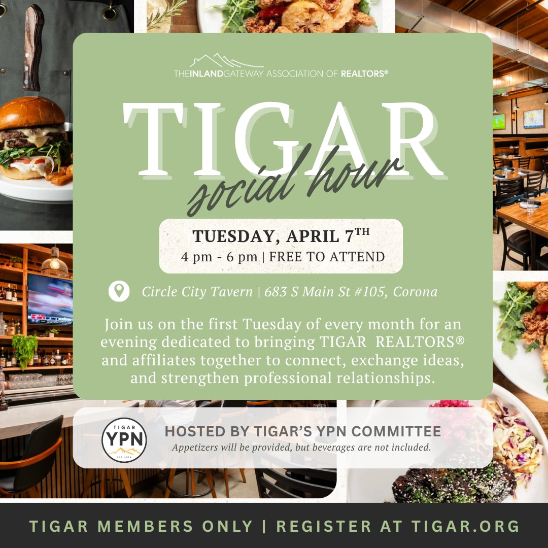 TIGAR Social Hour is here! Join us on the first Tuesday of every month for a fun, casual way to connect with fellow REALTORS® & Affiliates