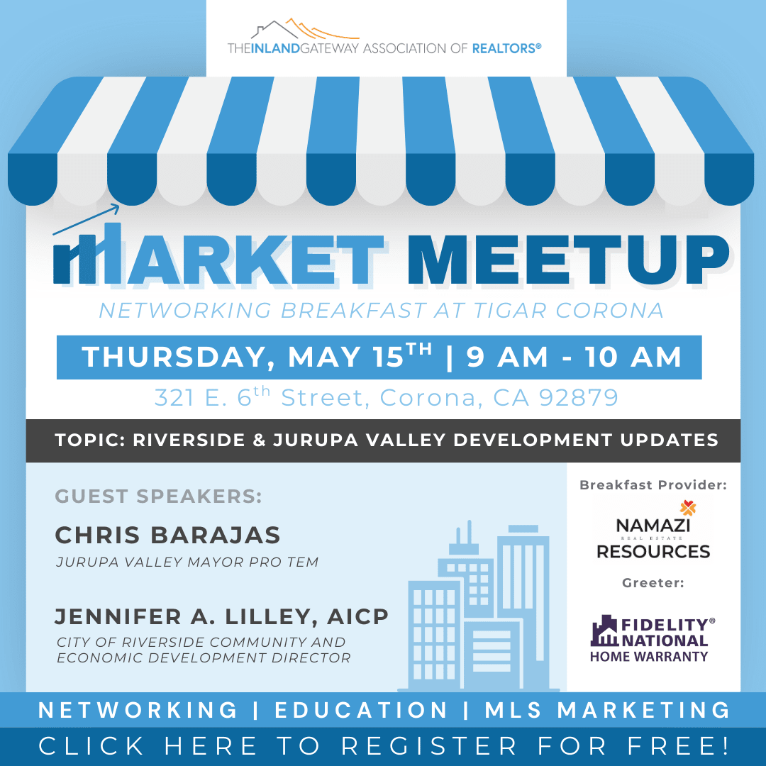 Get the latest updates on Riverside & Jurupa Valley development from Jurupa Valley Mayor Pro Tem Chris Barajas and Jennifer A. Lilley, AICP, City of Riverside Community & Economic Development Director. Enjoy breakfast sponsored by Namazi Real Estate Resources and meet our greeter from Fidelity National Home Warranty. Don’t miss this chance to stay informed and connected! Doors open at 8:30 AM, giving you time to grab a delicious breakfast before the meeting begins at 9:00 AM. Register for free today!