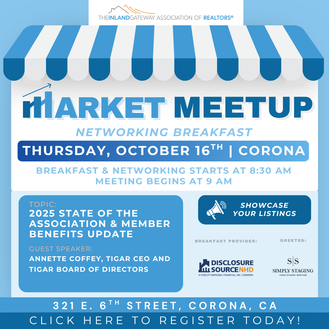 Fuel your morning with knowledge and connections at TIGAR’s Market Meetup Breakfast Meeting! Join us on the 3rd Thursday of every month at TIGAR Corona (321 E. Sixth Street, Corona, CA 92879) for an engaging and informative session focused on the real estate industry. Doors open at 8:30 AM, giving you time to grab a delicious breakfast provided by one of our affiliates before the meeting begins at 9:00 AM.
