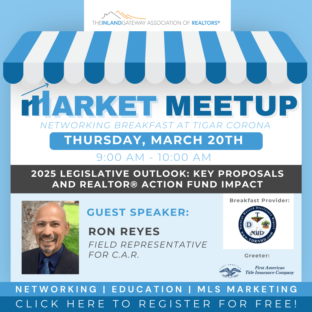 Join us for an informative session with Ron Reyes, Field Representative for the California Association of REALTORS® (C.A.R.), as he provides a legislative update on key proposals that could impact the real estate industry this year. Learn about the most pressing legislative issues, how they may affect your business, and why supporting the REALTOR® Action Fund is crucial in advocating for policies that protect homeownership and property rights. Don’t miss this opportunity to stay informed and engaged in shaping the future of real estate!