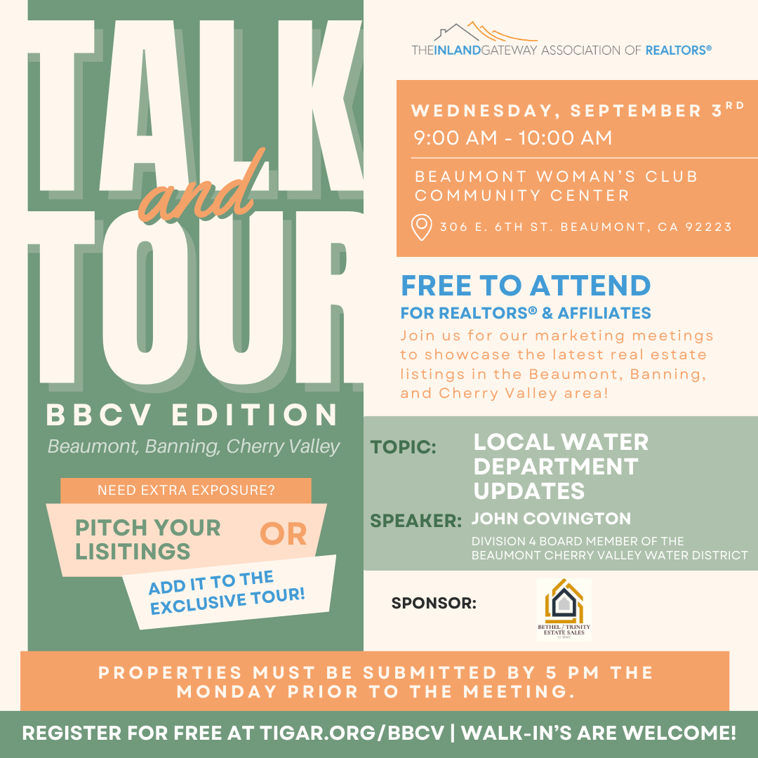 Join us for an engaging and informative twice-monthly event designed to showcase the latest real estate listings in the Beaumont, Banning, and Cherry Valley area! Talk & Tour: BBCV Edition brings together local agents, affiliates, and industry professionals for a dynamic networking experience. Attendees will have the chance to submit their listings for an exclusive caravan, hear from guest speakers, and connect with others in the real estate community. Whether you're looking to share your latest property or gain insights from industry experts, this event is the perfect opportunity to grow your network and learn something new!