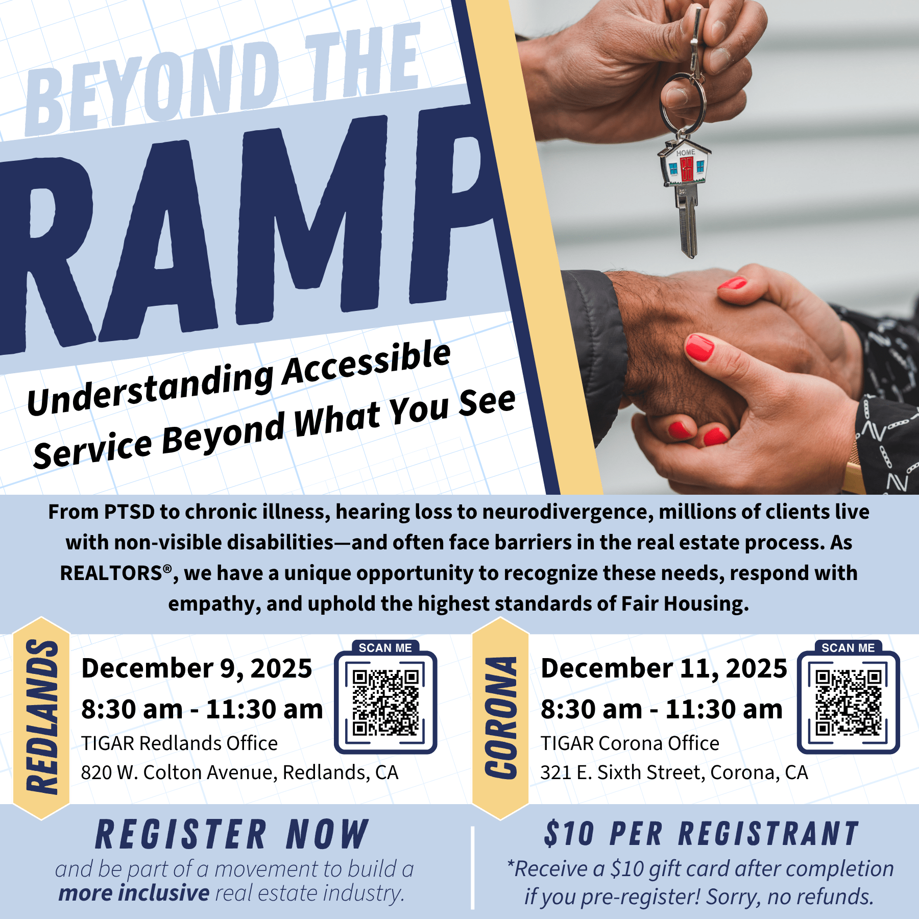 While physical accessibility is often visible, many housing challenges are not. From PTSD to chronic illness, hearing loss to neurodivergence, millions of clients live with non-visible disabilities—and often face barriers in the real estate process. As REALTORS®, we have a unique opportunity to recognize these needs, respond with empathy, and uphold the highest standards of Fair Housing. This inspiring class will help you: Understand the experiences of clients with non-visible disabilities Learn practical ways to support diverse accessibility needs Explore legal protections and best practices under Fair Housing law Engage with real stories, expert guidance, and actionable takeaways REGISTER NOW and be part of a movement to build a more inclusive real estate industry.
