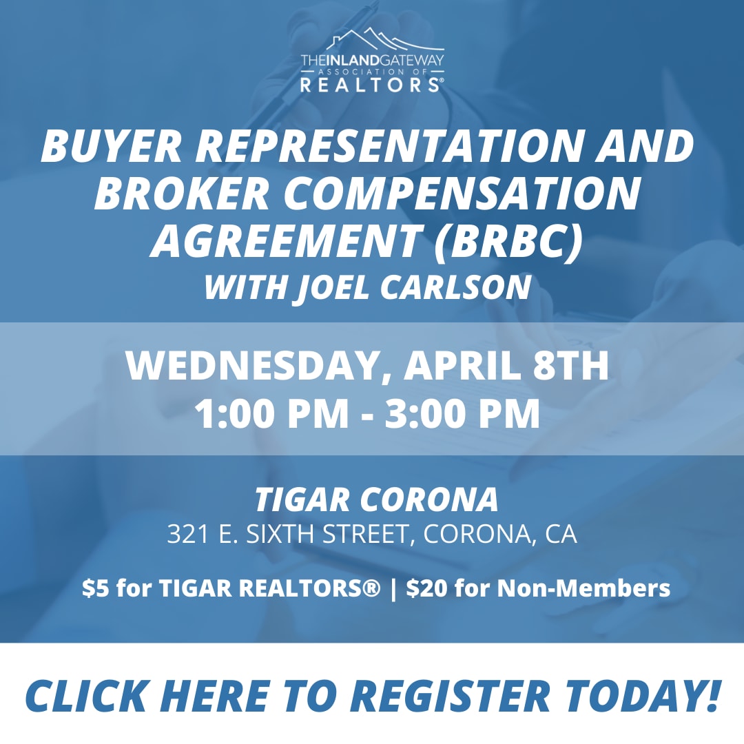 Please join our IN-PERSON class with Joel Carlson to learn about buyer representation and broker compensation agreement. April 8, 2026 from 1:00 PM– 3:00 PM at the TIGAR Corona Office. $5- TIGAR REALTOR® Members $20- Non-members
