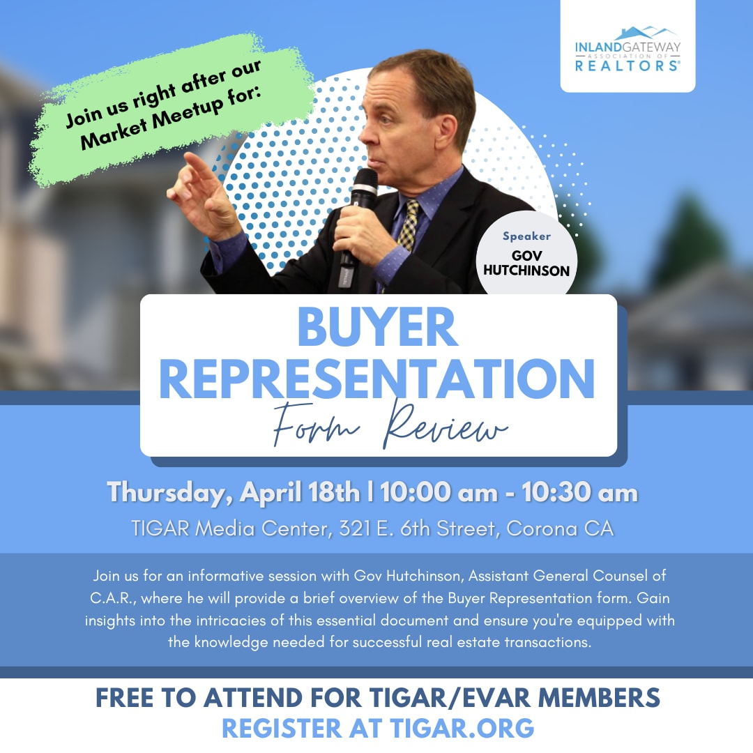 Join us for a 30 minute session with Gov Hutchinson, Assistant General Counsel of C.A.R., right after our Market Meetup, where he will provide a brief overview of the Buyer Representation form. Gain insights into the intricacies of this essential document and ensure you're equipped with the knowledge needed for successful real estate transactions.