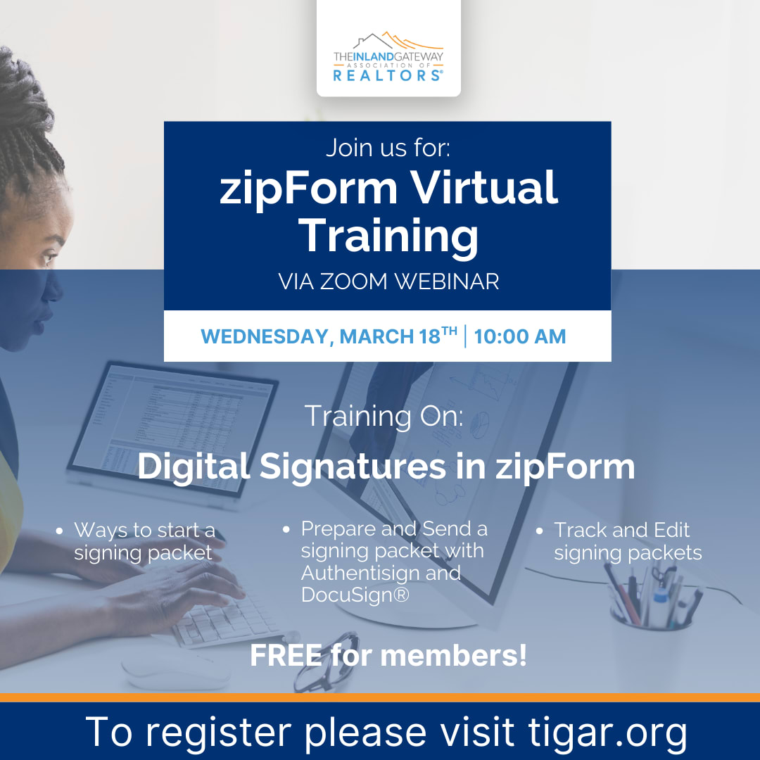 Streamline the signing process for you and your clients using the electronic signature tools inside your transaction. Transactions support two integrated e-Sign platforms—Authentisign and DocuSign®—giving you flexibility to track, edit, and manage digital signatures for your transaction documents. Both Authentisign and DocuSign® are programmed to auto-populate signature, date, and initial tags on most of your real estate forms. Authentisign is the member benefit signing service inside zipForm and provides unlimited digital signatures for documents within your transactions. DocuSign® is a paid third-party signing service that integrates with your zipForm account. Unlike Authentisign, DocuSign requires a separate paid subscription, which is optional. We will cover how to prepare and send a signing packet, track packet progress, and edit the packet if needed. We would like to thank The Inland Gateway Association of Realtors for providing this member-only training. Training sessions like these make it possible for REALTORS® to see their member benefits and tools in action. Can’t make it? Register anyway, and we’ll send you the recording. Sign up today for this FREE training!Images
