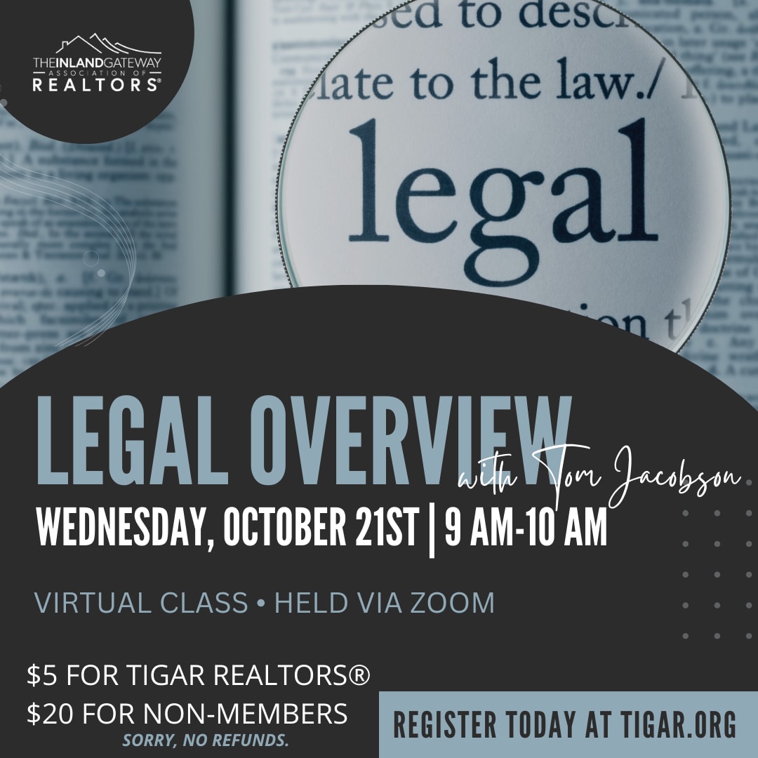 Join Legal Counsel, Tom Jacobson, for a VIRTUAL legal overview on October 21st at 9:00 AM. Don't miss out on this engaging session from the comfort of your own home! Sign up today! $5 for TIGAR members - $20 for Non Members **Sorry, no refundsImages
