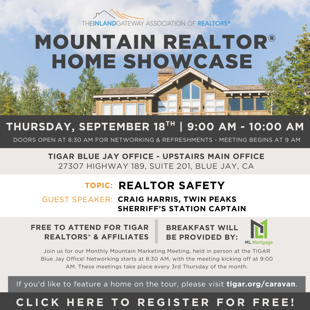 Please join us for our Monthly Mountain Marketing Meeting! Meetings will be in person at the TIGAR Blue Jay Office in the downstairs boardroom. Breakfast and networking begins at 8:30 am while the meeting starts at 9:00 am. Mountain Area Marketing Meetings will be held the 3rd Thursday of every month. This is also a chance for agents to add their listings to the Mountain Tour or pitch them at the meeting!