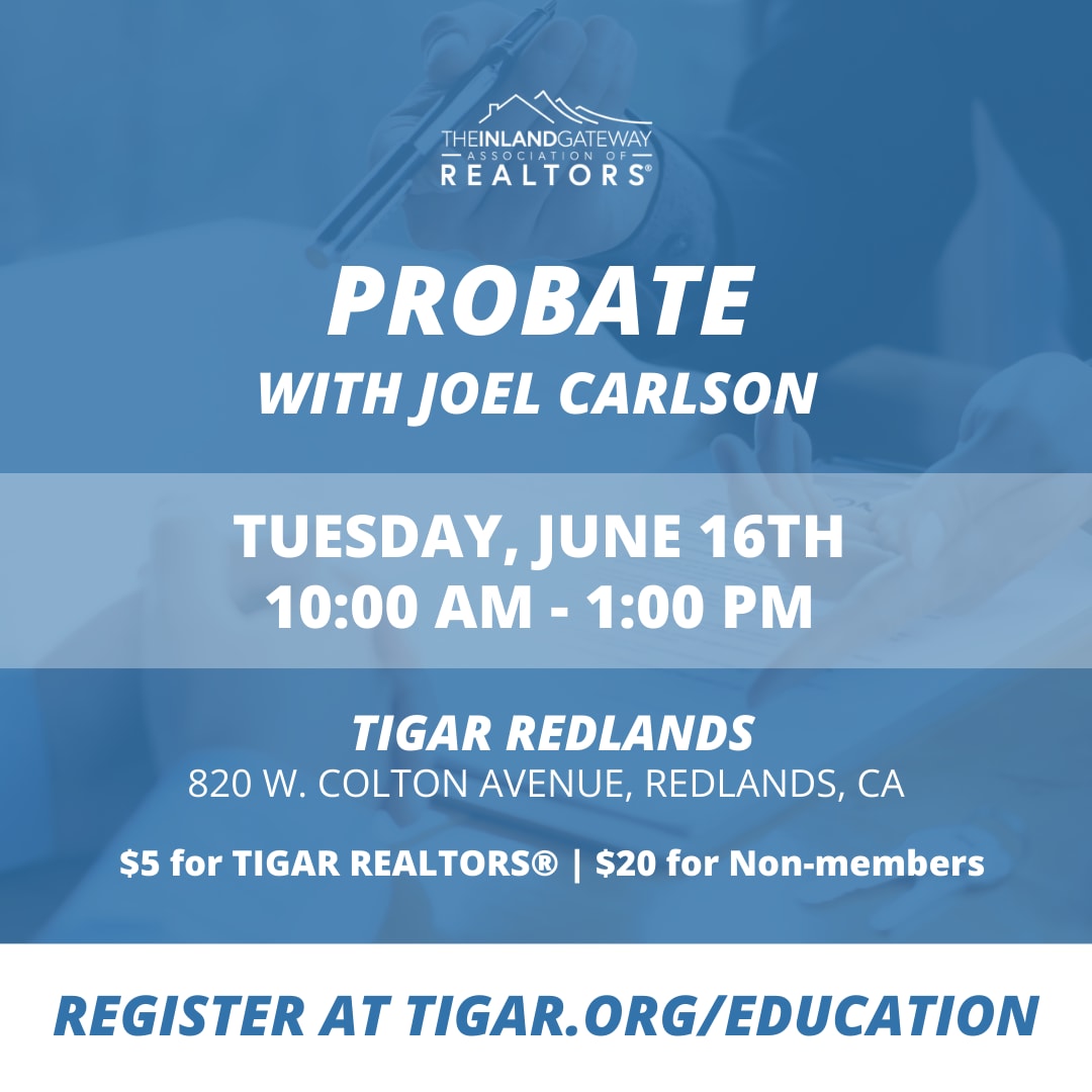 Please join our IN PERSON class with Joel Carlson and learn everything about Probate! TIGAR Redlands – 820 W. Colton Ave, Redlands, CA $5-TIGAR REALTOR® Members $20-Non members ** Sorry, no refundsImages
