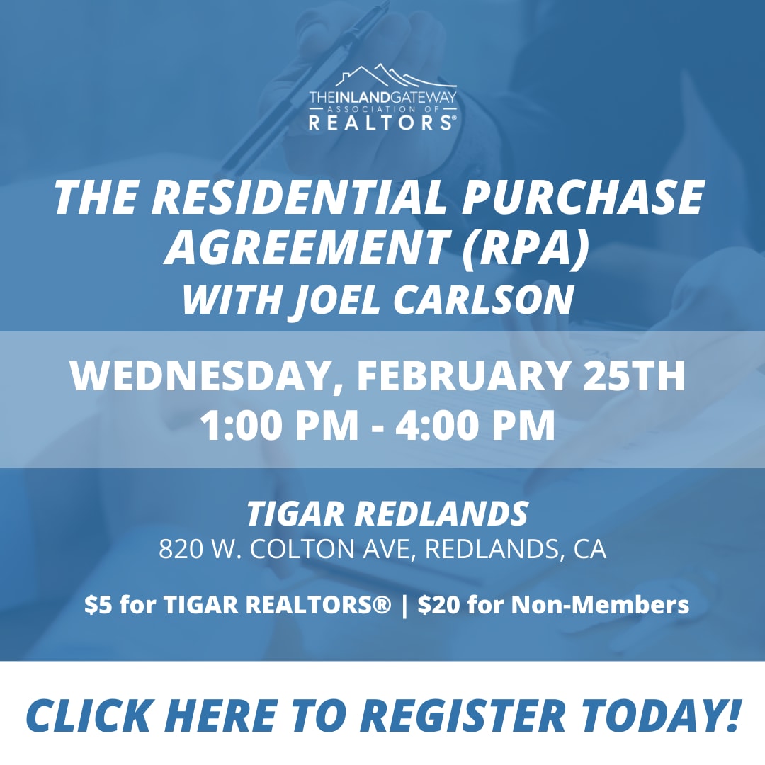 📄 The Residential Purchase Agreement (RPA) with Joel Carlson Join us for an in-depth class on the Residential Purchase Agreement (RPA) led by Joel Carlson. Gain the knowledge and confidence you need to navigate this essential contract successfully. 📅 Wednesday, February 25th 🕙 1:00pm-4:00pm📍 TIGAR Redlands – 820 W. Colton Ave, Redlands, CA 💲 $5 for TIGAR REALTORS® | $20 for Non-members 👉 Don’t miss this opportunity to sharpen your skills— Register today!