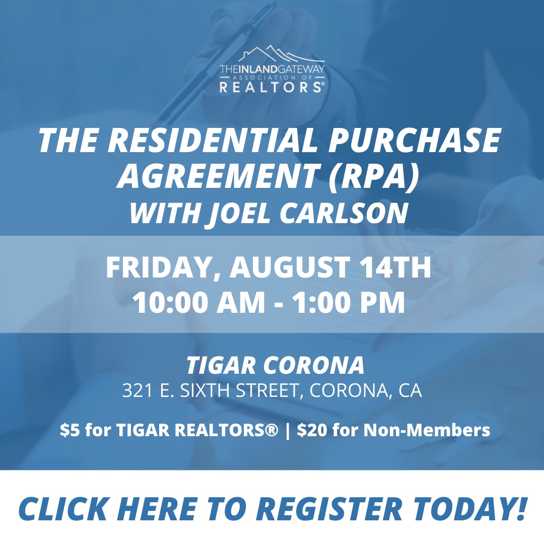 📄 The Residential Purchase Agreement (RPA) with Joel Carlson Join us for an in-depth class on the Residential Purchase Agreement (RPA) led by Joel Carlson. Gain the knowledge and confidence you need to navigate this essential contract successfully. 📅 Friday, August 14th 🕙 10:00am-1:00pm📍 TIGAR Corona – 321 E Sixth St, Corona, CA💲 $5 for TIGAR REALTORS® | $20 for Non-members 👉 Don’t miss this opportunity to sharpen your skills— Register today! ** Sorry, no refundsImages