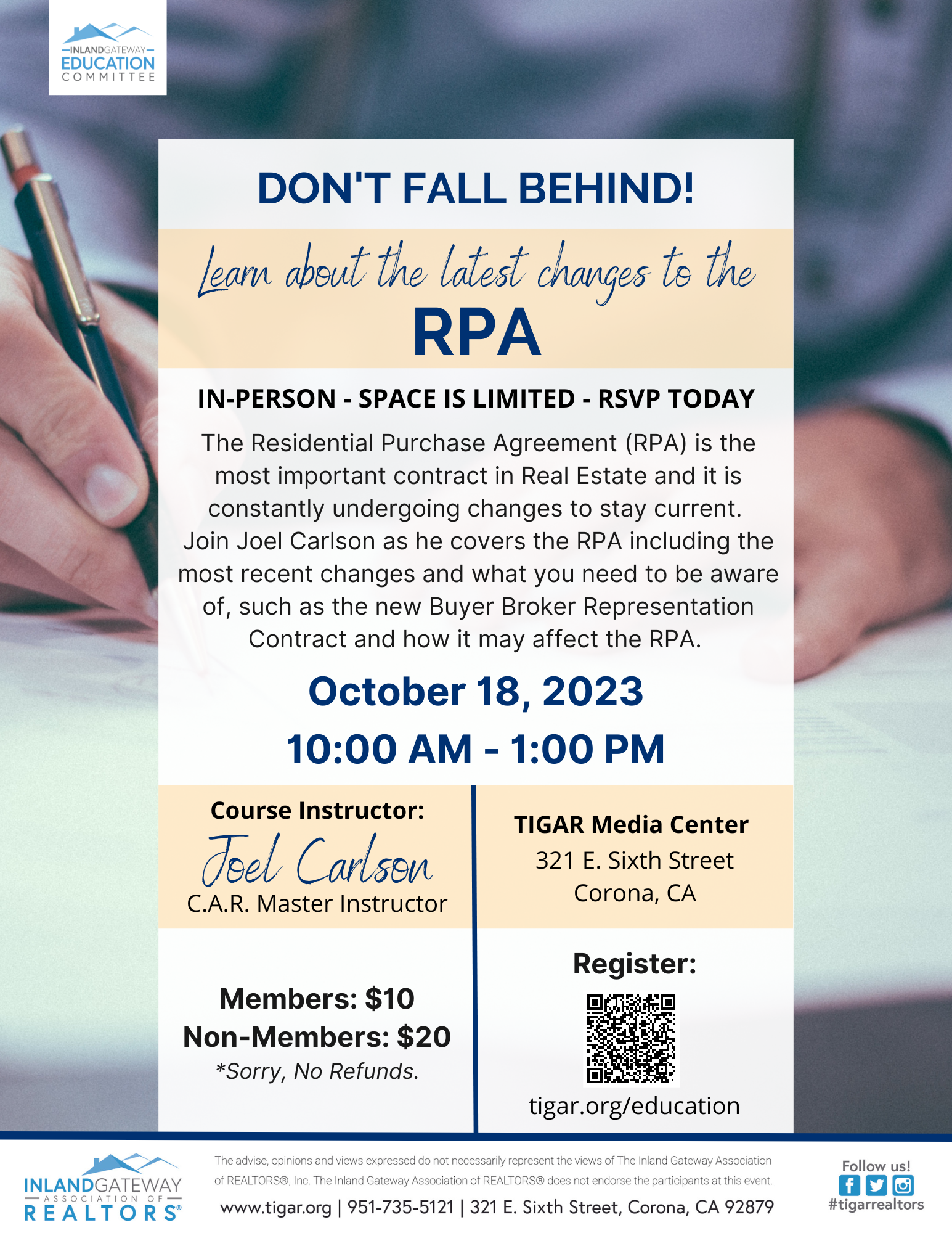 Don't fall behind! The Residential Purchase Agreement (RPA) is the most important contract in Real Estate and it is constantly undergoing changes to stay current. Join Joel Carlson as he covers the RPA including the most recent changes and what you need to be aware of, such as the new Buyer Broker Representation Contract and how it may affect the RPA.