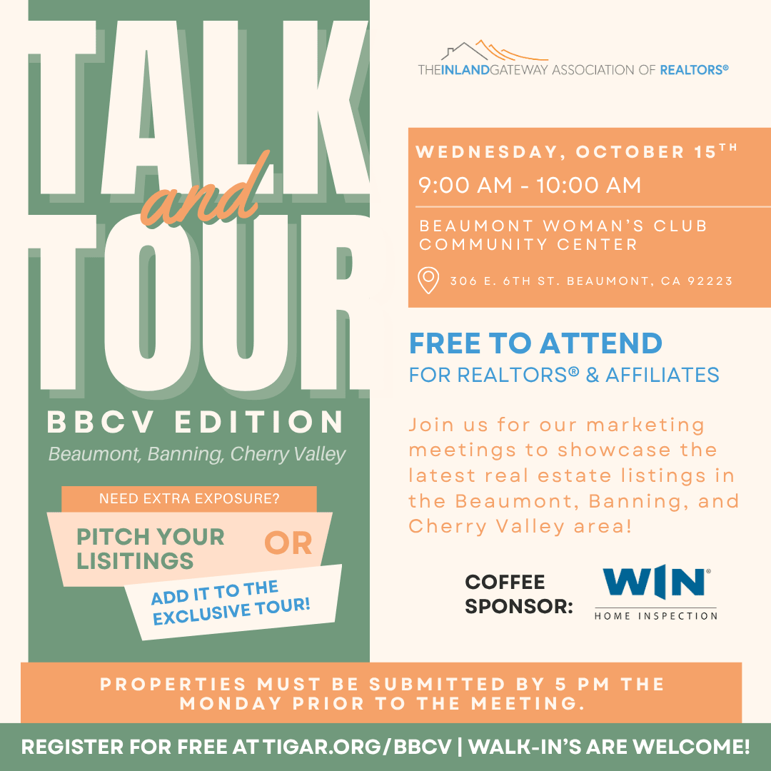 Join us for an engaging and informative twice-monthly event designed to showcase the latest real estate listings in the Beaumont, Banning, and Cherry Valley area! Talk & Tour: BBCV Edition brings together local agents, affiliates, and industry professionals for a dynamic networking experience. Attendees will have the chance to submit their listings for an exclusive caravan, hear from guest speakers, and connect with others in the real estate community. Whether you're looking to share your latest property or gain insights from industry experts, this event is the perfect opportunity to grow your network and learn something new!