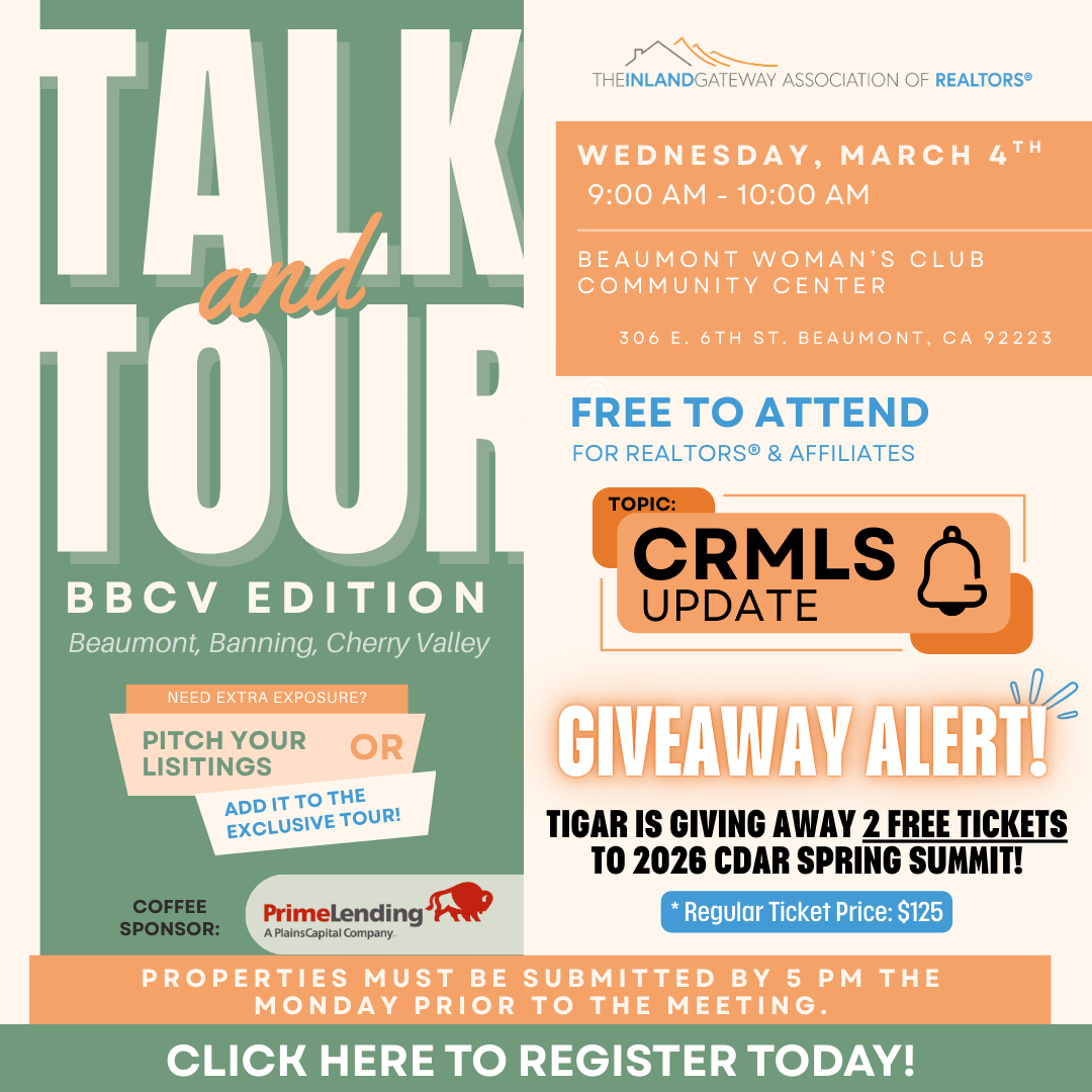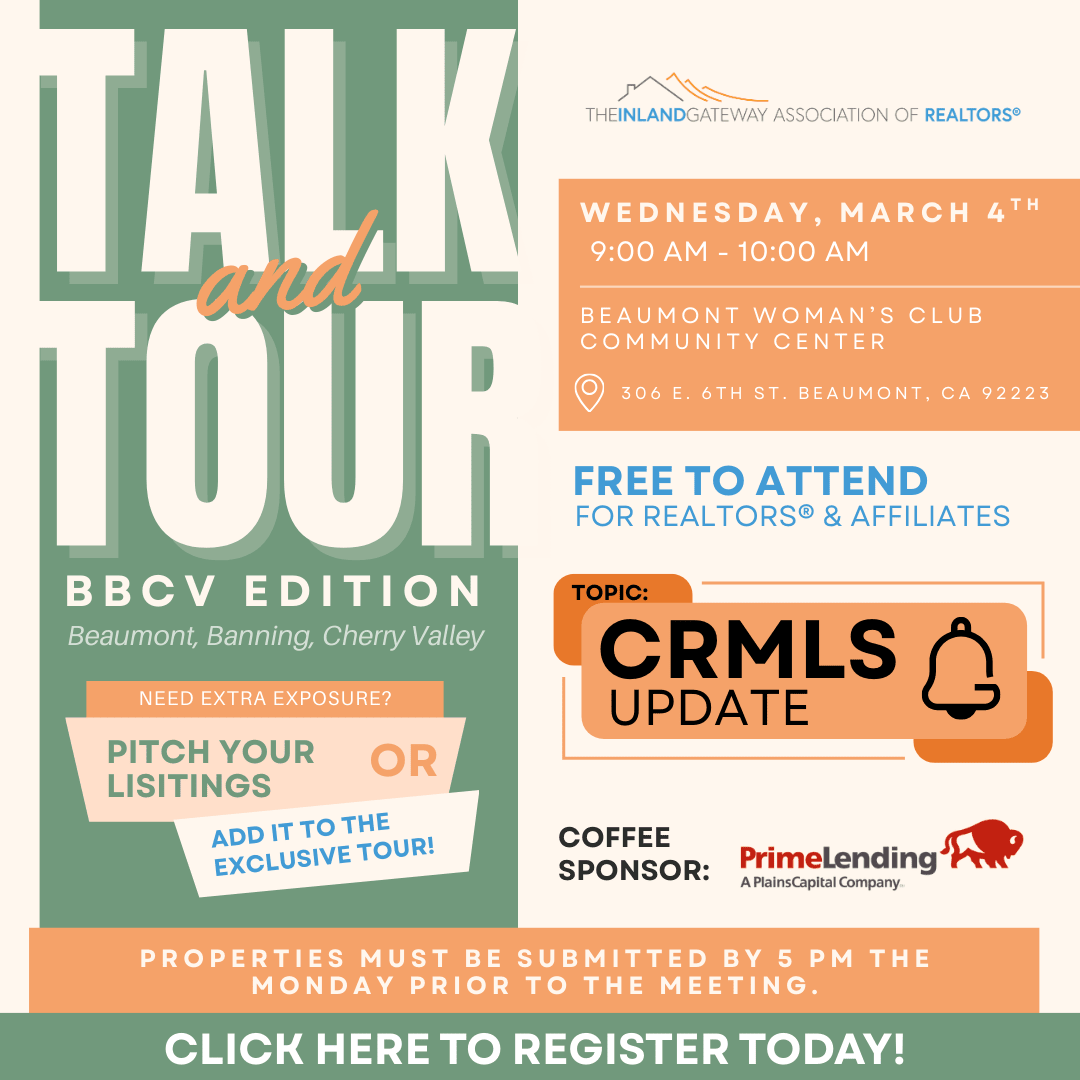 Join us for an engaging and informative twice-monthly event designed to showcase the latest real estate listings in the Beaumont, Banning, and Cherry Valley area! Talk & Tour: BBCV Edition brings together local agents, affiliates, and industry professionals for a dynamic networking experience. Attendees will have the chance to submit their listings for an exclusive caravan, hear from guest speakers, and connect with others in the real estate community. Whether you're looking to share your latest property or gain insights from industry experts, this event is the perfect opportunity to grow your network and learn something new!