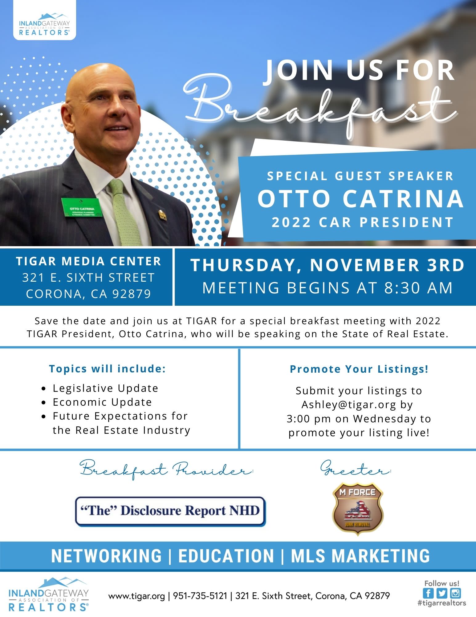 Join us for our Thursday Breakfast Meetings! Our meetings are held on the 1st and 3rd Thursday of each month (with some exceptions) in the TIGAR Media Center at 321 E. Sixth Street, Corona, CA 92879. Thursday meetings are a great way for our members to network with fellow REALTORS® and Affiliates! Affiliates are also welcome to sponsor our breakfast meetings as breakfast providers and/or greeters!