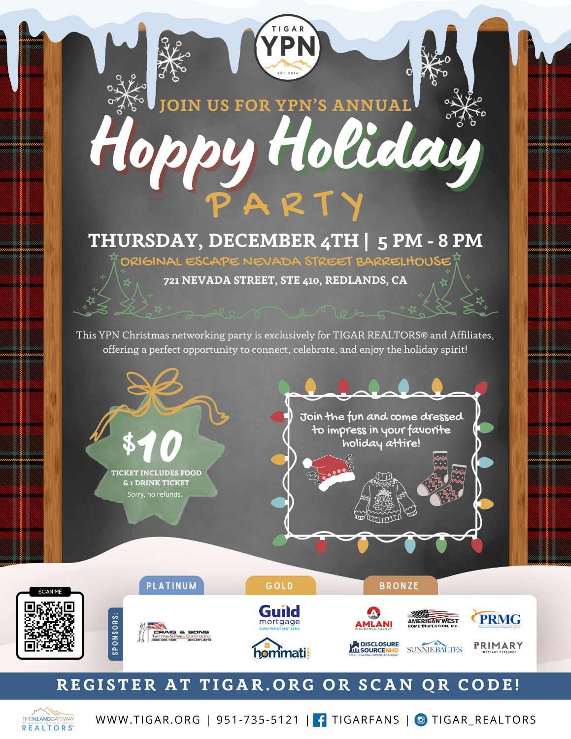 Join us for a festive evening on Thursday, December 4, 2025, from 5:00 p.m. to 8:00 p.m. at the Original Escape Nevada Street Barrelhouse, located at 721 Nevada Street, Suite 410, in Redlands, CA. This YPN Christmas networking party offers a perfect opportunity to connect, celebrate, and enjoy the holiday spirit. Come dressed to impress in your best holiday attire! Tickets are $10 per person and include food and 1 drink ticket. Don't miss this chance to end the year on a high note - secure your spot today!