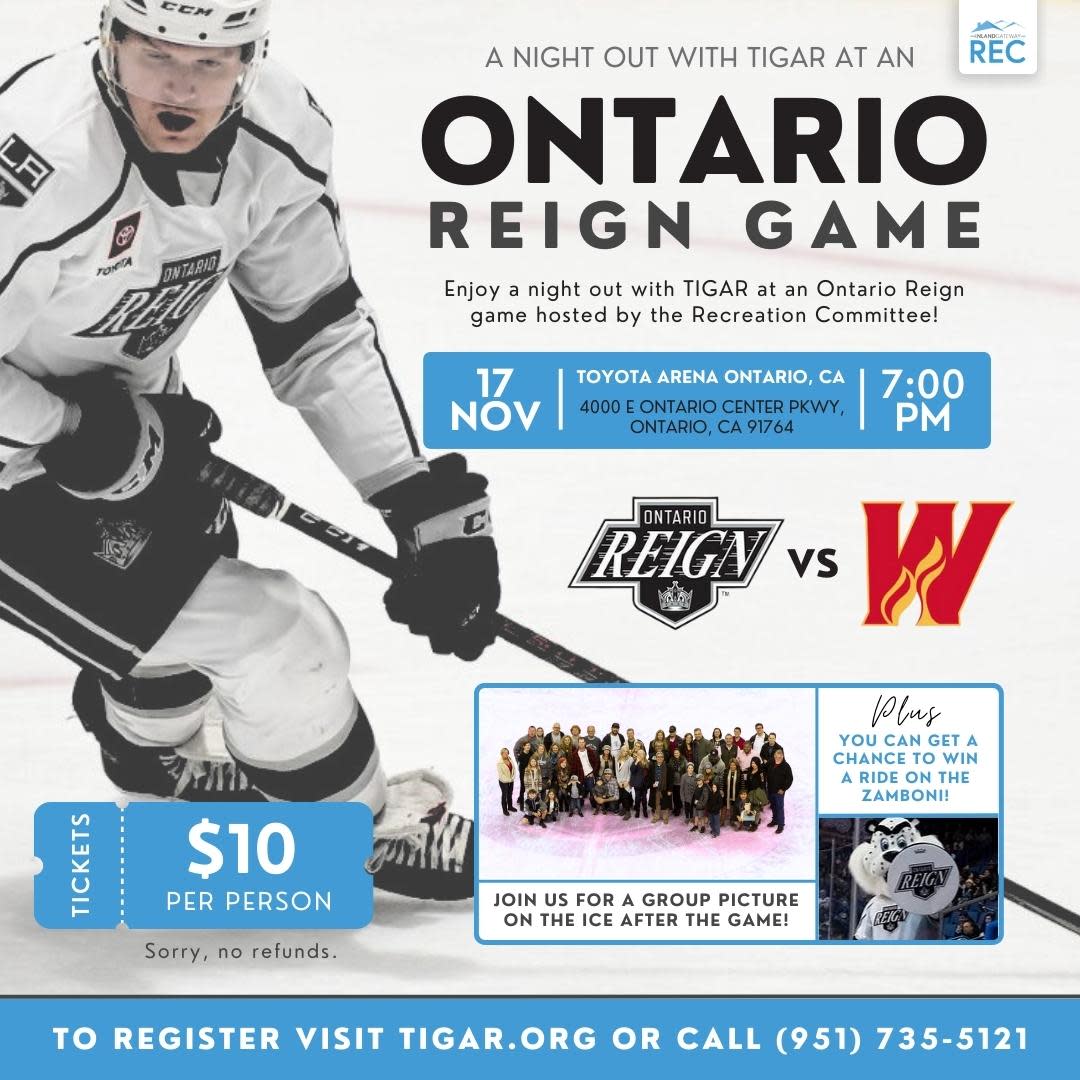 Join us for a night out to the Ontario Reign vs Calgary Wranglers hockey game! When you purchase your ticket, you will be automatically entered for a chance to win a ride on the Zamboni. Don't forget to capture your special memories by taking a photo on the ice at the end of the game!