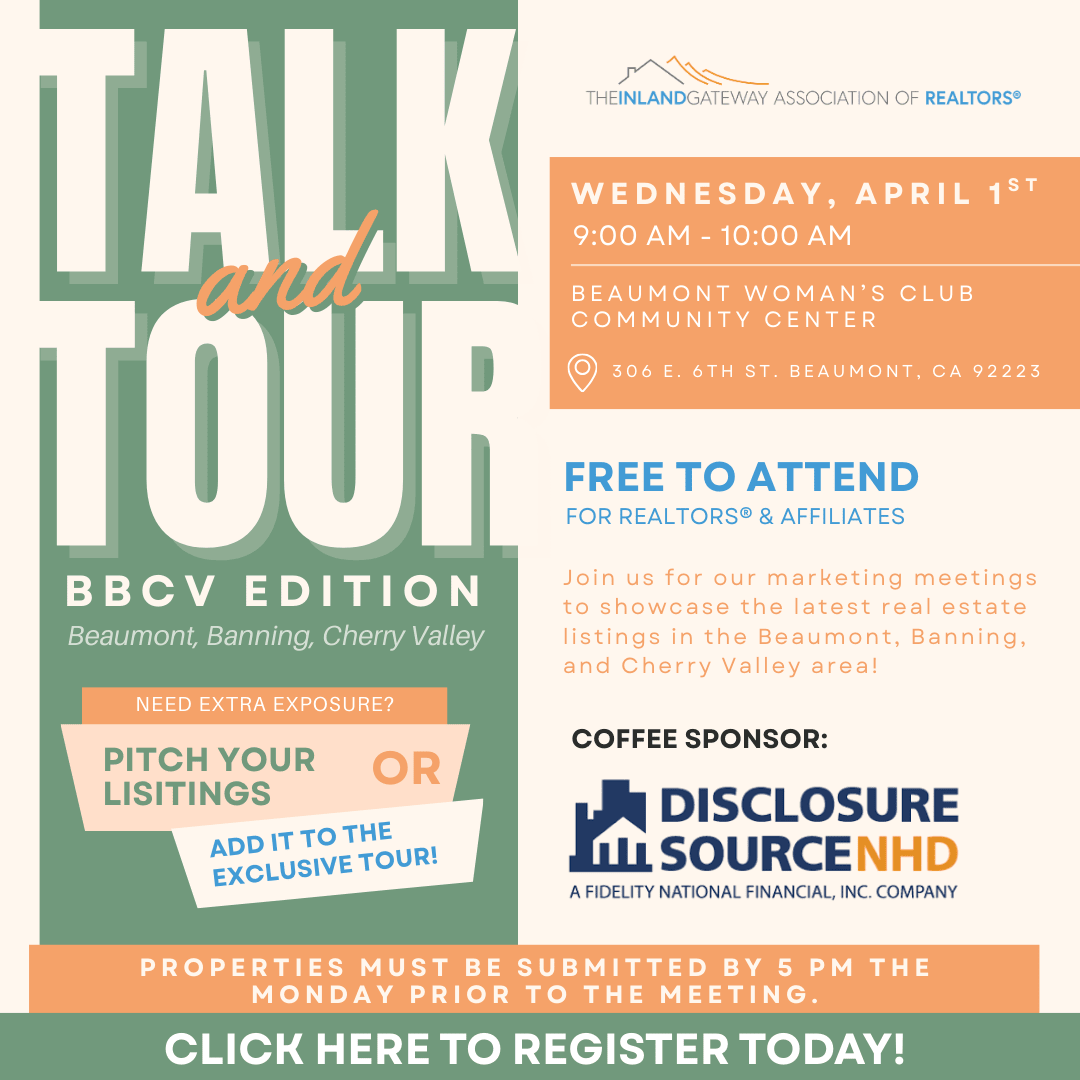 Join us for an engaging and informative twice-monthly event designed to showcase the latest real estate listings in the Beaumont, Banning, and Cherry Valley area! Talk & Tour: BBCV Edition brings together local agents, affiliates, and industry professionals for a dynamic networking experience. Attendees will have the chance to submit their listings for an exclusive caravan, hear from guest speakers, and connect with others in the real estate community. Whether you're looking to share your latest property or gain insights from industry experts, this event is the perfect opportunity to grow your network and learn something new!