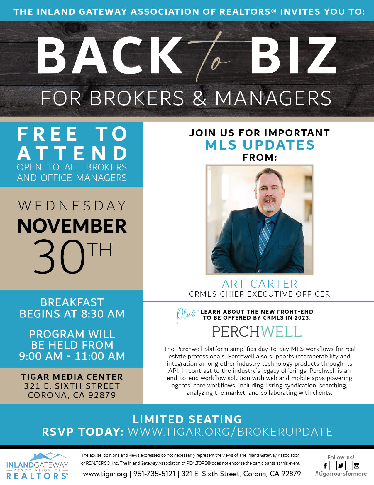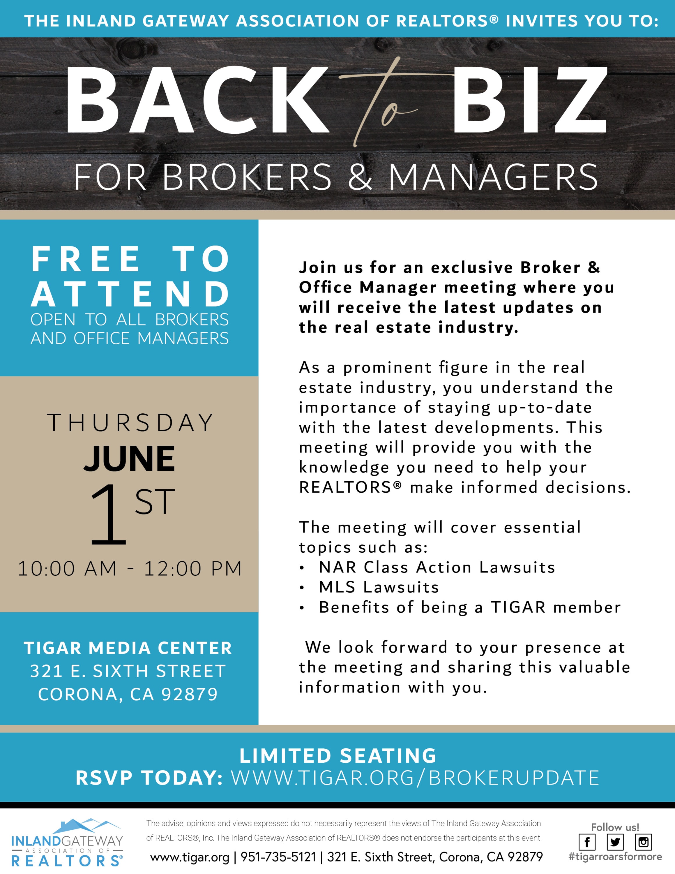 Join us for Back to Biz for Brokers Managers Meeting on Thursday, June 1st! We welcome all TIGAR Brokers and Office Managers for our annual meeting to get updates on the latest changes in your industry.