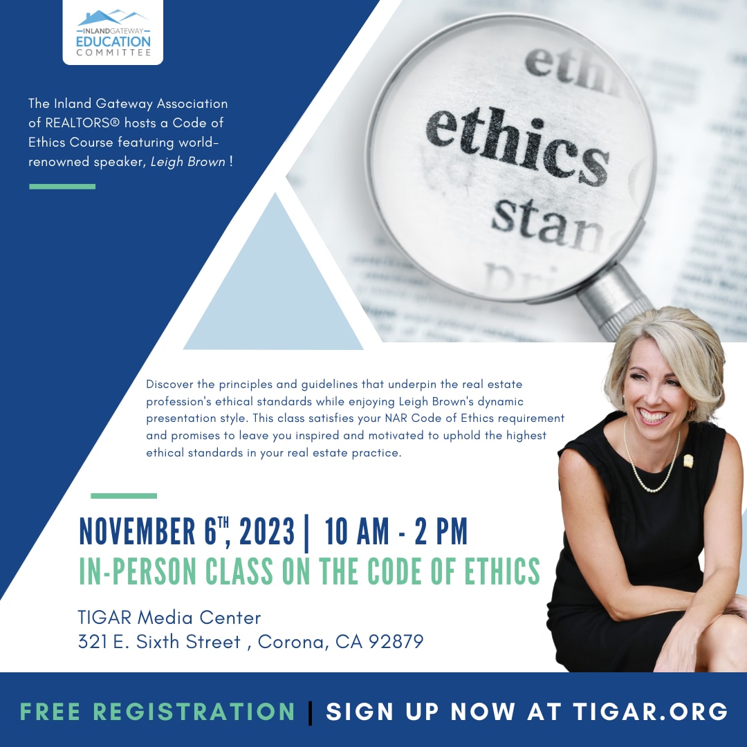 Renowned speaker and real estate veteran, Leigh Brown will cover all 17 articles of the Code of Ethics in a fun and engaging way, with case studies and expert insights. 🙌 Don't miss out on this amazing opportunity to fulfill your NAR Code of Ethics requirement, improve real estate professionalism and grow your businesses! NAR requires all REALTORS® to complete their Code of Ethics every 3 years. The current period is January 1, 2022 - December 31, 2024. Take this opportunity to satisfy your requirement before it's too late! Sign up today!