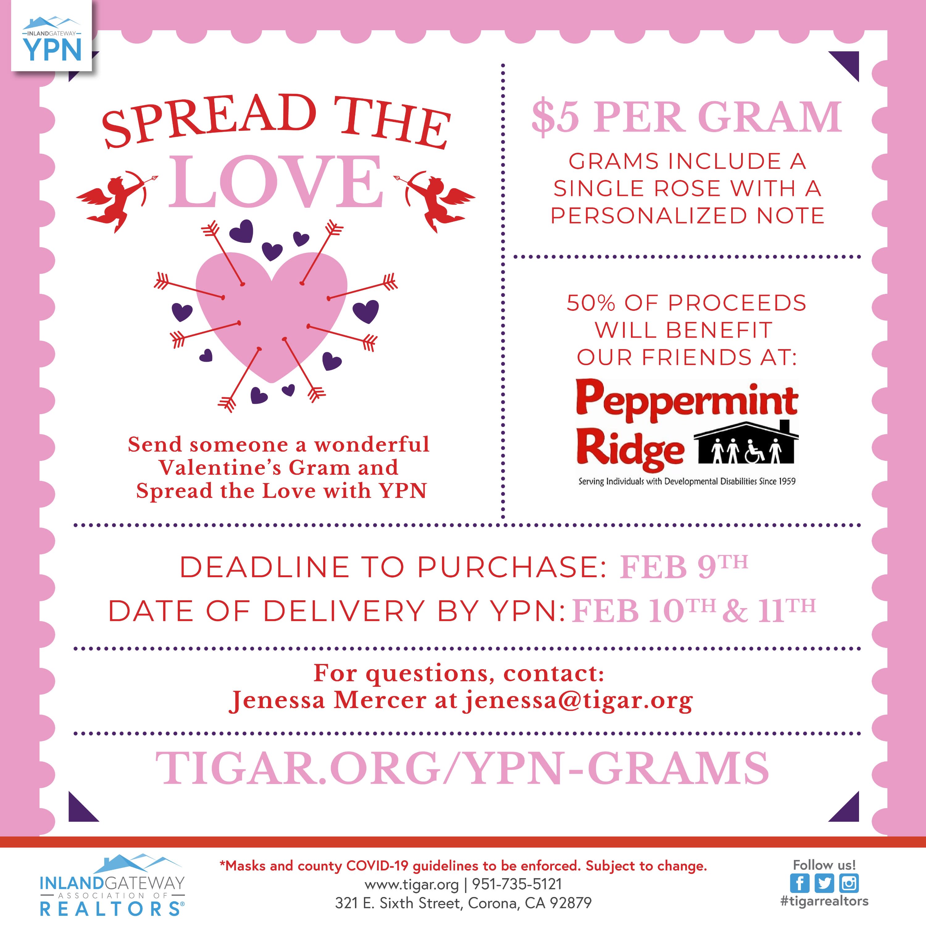 Spread the Love with TIGAR YPN! Purchase Valentine's Grams for $5 each to send to your friends and family to show them you care! Grams will be a single rose with a personalized message attached with a ribbon. Last day to purchase is February 9, 2022. Delivery by YPN will be on February 10 and 11, 2022. 50% of proceeds will benefit our friends at Peppermint Ridge.